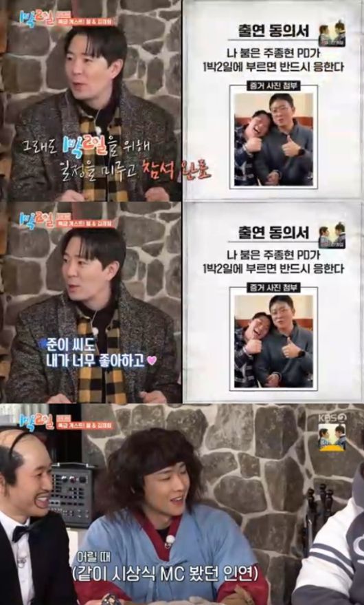붐은 "멤버들 보고 싶고 준이 씨도 내가 너무 좋아하고 에너지를 느끼고 싶어서 왔다"고 '1박 2일' 출연을 위해 일정을 조정했다고 전했다.