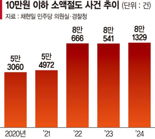 18일 국회 행정안전위원회 소속 채현일 더불어민주당 의원실이 경찰청에서 제출받은 '소액 절도 사건 현황'에 따르면 지난 2024년 재산 피해액이 10만원 이하인 절도 사건은 8만1329건으로 5년 새 최대치를 기록했다. 이는 2020년(5만3060건)과 비교해 53% 늘어난 수치다. 2025년은 아직 집계되지 않았다. 다만 소액 절도가 3년 연속 8만건을 넘긴 점, 범행이 주로 이뤄지는 무인점포가 늘고 있는 점 등을 감안하면 비슷한 수준이거나 기록을 경신할 것으로 관측된다.