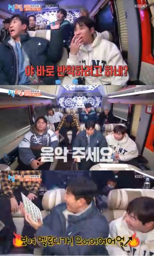 멤버들은 버스를 타고 다음 장소로 이동하면서 퀴즈를 시작했다.