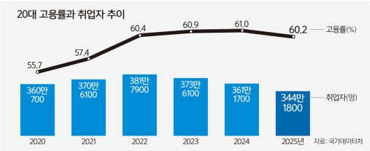 18일 국가데이터처의 경제활동인구 조사 결과를 보면 지난해 20대 취업자 수는 344만1800명으로 전년 대비 16만9900명(-4.7%) 감소했다. 20대 취업자의 감소세는 3년째 이어지고 있다. 코로나19 사태가 터진 2020년(-3.9%) 이후 반등한 취업자 수는 2023년(-2.1%)과 2024년(-3.3%) 감소세를 이어가다 지난해 감소폭을 더 키웠다.