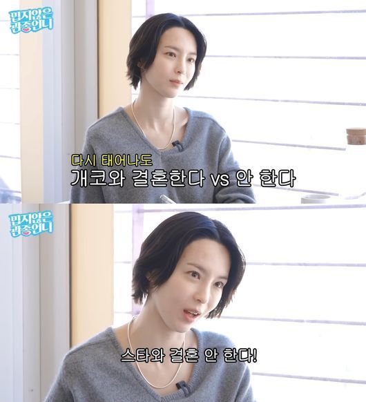 이에 MC 이지혜가 “스타와 결혼한다, 안 한다”라고 질문을 바꾸자 김수미는 “저는 스타와 결혼 안 한다”고 단호하게 답했다. 그는 “스타의 아내로 사는 삶은 생각보다 쉽지 않다”며 “연극을 마치고 소감을 말할 때도 ‘누군가의 아내가 아닌, 그냥 인간 김수미로 존재하게 해줘서 감사하다’고 했다”고 솔직한 심정을 털어놨다.