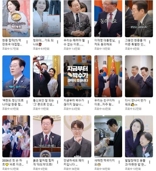 올해 이 대통령 유튜브 채널에 게시된 쇼츠(60초 길이의 짧은 영상) 중 가장 조회수가 높은 영상은 이 대통령의 떡국 먹방이 담긴 ‘새해엔 떡국이지요’다. 이 대통령은 새해 첫날인 지난 1일 국립현충원을 방문한 뒤 청와대 직원 식당을 방문해 참모들과 떡국을 먹었다. 이 대통령이 직원 식당에서 식사를 준비하는 직원들과 인사를 나누고, 참모들과 웃으며 떡국을 나누는 해당 쇼츠의 조회수는 50만회를 훌쩍 넘었다. 새해 첫날을 맞아 떡국을 먹는 이 대통령의 소탈한 모습이 인기를 끈 것으로 분석된다.