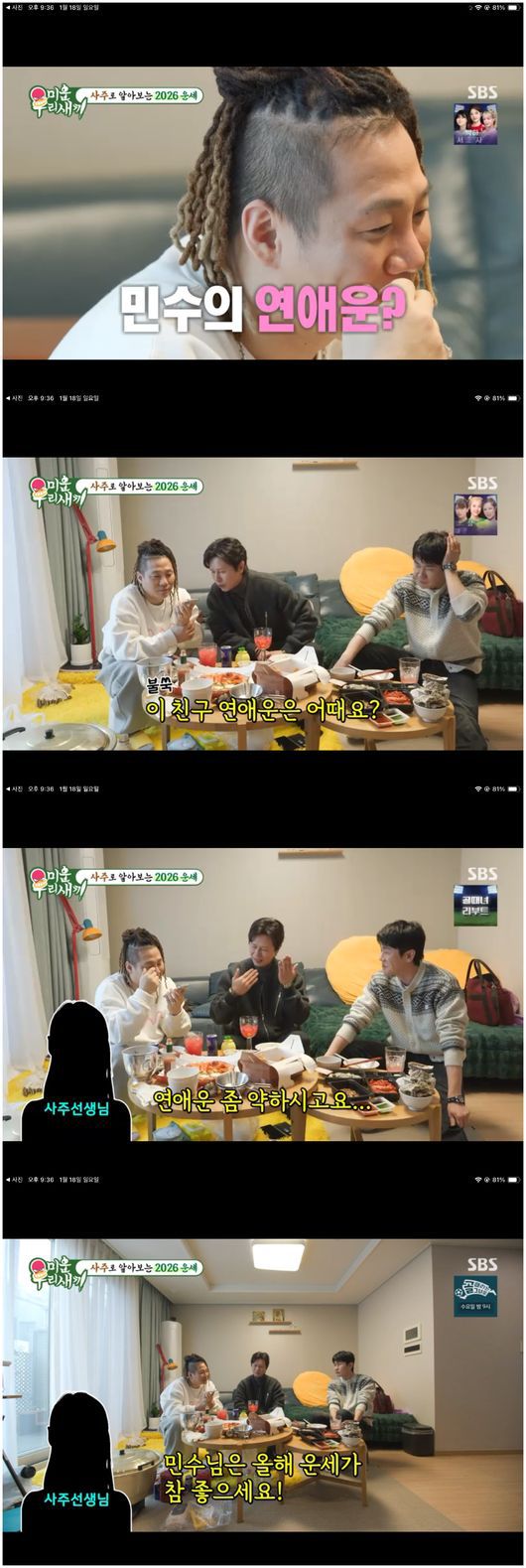윤민수에 대해 사주 선생님은 “윤민수는 올해 운세가 참 좋다. 올해는 상복이 정말 크고”라고 말해 윤민수와 어머니를 활짝 웃게 만들었다. 김민종은 “윤민수는 연애운은 어떠냐”라며 냉큼 물었다. 사주 선생님은 “연애운은 약하다. 생겨도 썸만 타고 끝날 가능성이 있다”라고 말했다.