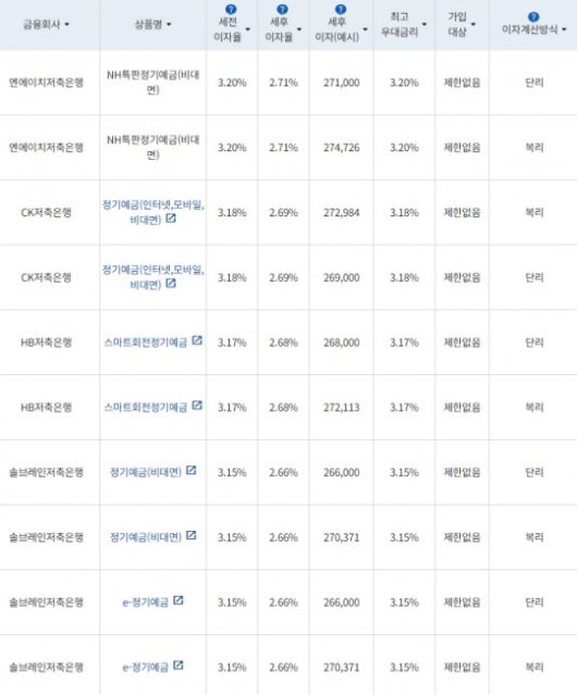 솔브레인저축은행의 정기예금(비대면)과 e-정기예금은 연 3.15%의 금리를 제공한다. 정기예금(비대면)의 가입대상은 만19세 이상의 개인이며, e-정기예금은 가입대상 제한이 없다. 두 상품의 세후 이자는 단리 기준 26만6000원, 복리 기준 27만원이다.