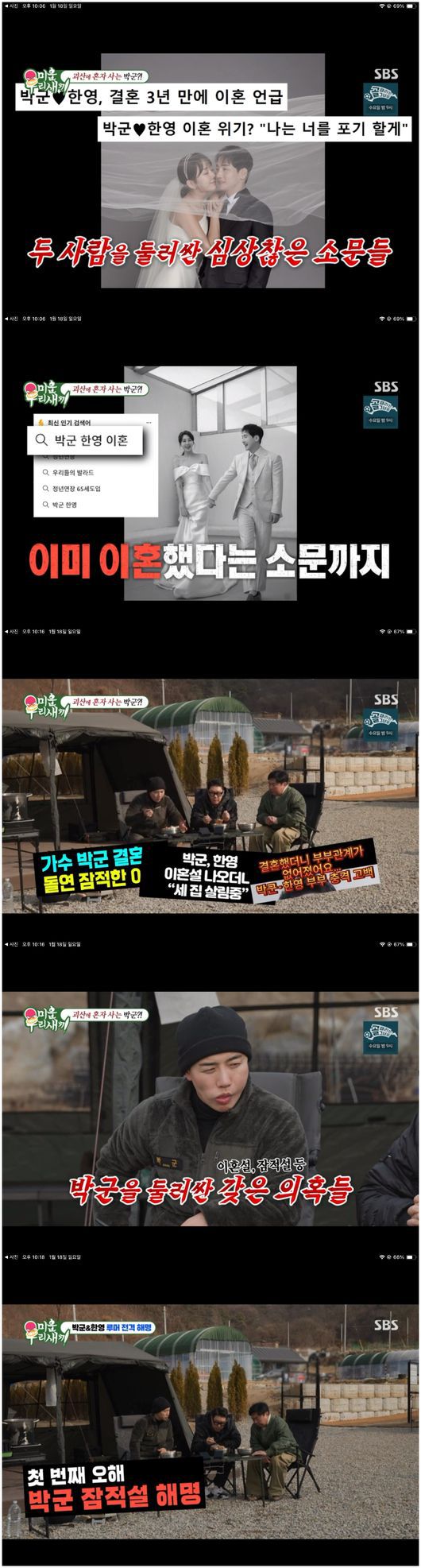 이상민은 “소문이 많더라. 박군 잠적설, 부부끼리 스킨십을 안 한다, 한영이 다른 집에 산다, 그런 말이 많다. 사람들이 소문을 믿을 거다”라고 물었다. 박군은 “잠적은 오해다. ‘6시 내 고향’ 리포트 중이라 한번씩 이틀이 걸려서 행사 철에 행사를 못 한다. 행사를 포기하고 어르신들 효도하는 리포트를 하고 싶다고 했더니 기자님들이 ‘모든 걸 포기했다’라고 쓰신 거다”라며 해명했다.