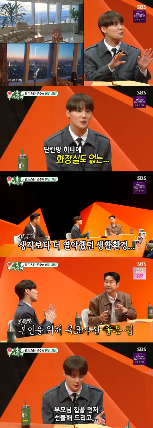 신동엽은 "어렸을 때 열악한 환경에서 자라 집을 중요하게 생각한다고 한다"라고 설명했고, 김준수는 "지금 돌아보면 가난하게 살았다고 느껴진다. 영화 '기생충'에 나오는 반지하에서 살았다. 거긴 거실, 화장실도 있던데 우리 집은 화장실도 없는 단칸방이었다"라고 말했다.