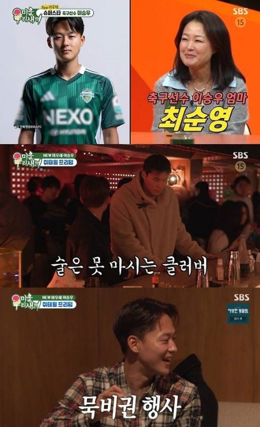 18일 방송한 SBS TV '미운 우리 새끼'에선 이승우가 송범근과 이태원 클럽을 찾는 모습이 그려졌다. MC 서장훈은 "이승우가 평소에도 클럽 가는 걸 좋아하느냐"고 물었고, 어머니 최순영씨는 "좋아한다"며 끄덕였다. 서장훈은 "어머니가 (클런 간 걸) 10번 알면 실제로 50번 가는 것"이라고 했다.