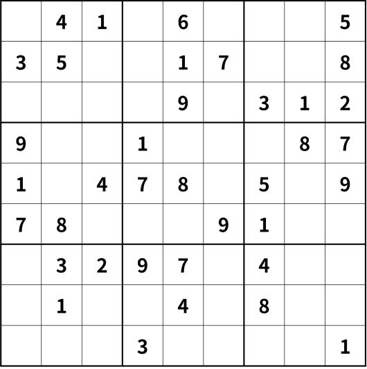 ※ 스도쿠 규칙: 숫자 1~9를 ①세로 9칸에 한 번씩만 써서 채운다. ②가로 9칸에도 한 번씩만 써서 채운다. ③굵은 선의 작은 사각형 3칸×3칸에도 한 번씩만 써서 채운다.