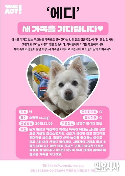 상처를 가지고 있는 구조견을 가족으로 맞이한다는 것은 결코 쉬운 결정이 아니란 걸 알지만, 그럼에도 우리는 사랑의 힘을 믿습니다. 아이들에게 기적을 만들어주세요.