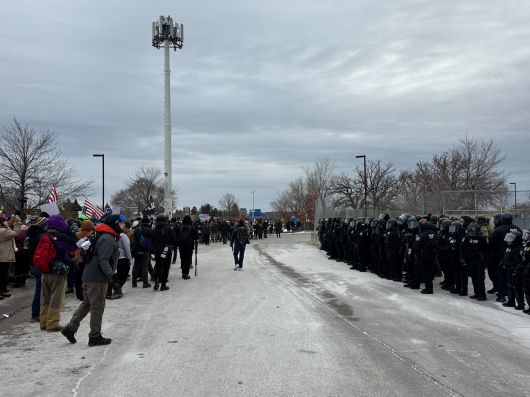 15일 찾은 미국 미네소타주(州) 미니애폴리스 인근 연방 건물인 ‘위플 빌딩’ 앞에는 중무장한 경찰 병력 100여 명과 시위대가 2차선 도로 하나를 사이에 두고 팽팽한 긴장감 속에 대치하고 있었다. 도널드 트럼프 대통령이 불법 이민자 단속을 지시해 이민세관단속국(ICE) 요원 약 3000명이 미니애폴리스 일대에 배치된 가운데, 지난 7일 백인 여성 르네 니콜 굿이 ICE 요원의 총격에 사망한 사건에 분노한 이들이 이곳으로 몰려와 매일같이 반(反)이민 구호를 외치고 있다. 전날 밤에도 베네수엘라 출신 이민자를 상대로 ICE 요원의 발포가 있었고, 이날 트럼프가 “내란법(Insurrection Act)을 발동할 수 있다”고 엄포를 놓은 터라 시위대가 더 격앙된 모습이었다. 이들은 펜스 너머로 보이는 ICE 요원들을 향해 “부끄러운 줄 알아라” “우리 동네에서 당장 나가라” “일단 사람부터 돼야 한다”고 야유를 퍼부었다. 시위대가 도로를 넘어올 땐 경찰이 경고를 한 뒤 최루탄 가스를 터뜨려 매캐한 연기가 눈과 코를 찔렀다. 이런 대치가 이날 오후 내내 반복됐다.