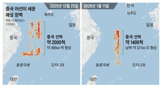 NYT는 해양 정보 업체 스타보드의 선박 위치 데이터를 분석해 지난 11일 중국 선박 약 1400척이 동중국해에서 직사각형 형태로 남북 약 321㎞ 길이의 띠를 만들었다고 보도했다. 대형이 워낙 촘촘해 일부 화물선이 ‘띠’ 주변을 우회하거나 그 사이를 지그재그로 통과하는 항적이 관측됐다고 한다. 지난해 성탄절에도 2000여 척이 같은 해역에 모여 ‘L자’ 형태의 ‘벽’을 세웠는데 당시 대형의 길이는 466㎞에 달했다고 NYT는 전했다.