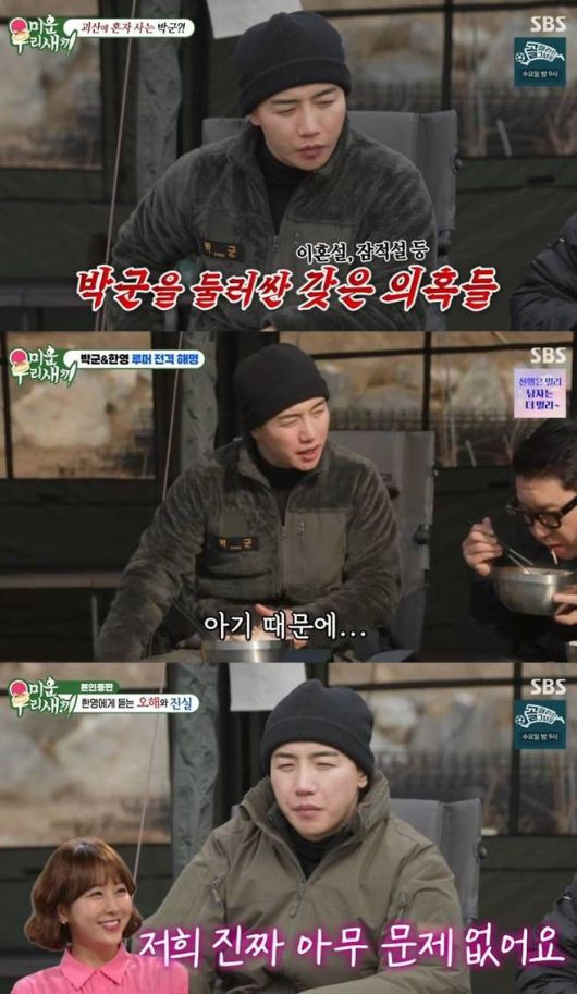 18일 방송한 SBS TV '미운 우리 새끼'에선 박군이 괴산에서 홀로 텐트 생활을 하는 모습이 공개됐다. 이날 그룹 '룰라' 출신 이상민과 임원희는 "소문이 한 두 개 도는 게 아니다. 사람들은 진짜인 줄 알 것"이라며 잠적설, 세집 살림설 등을 언급했다.