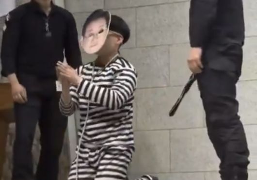 송영창 은평구의회 의장이 최근 엑스(X· 옛 트위터)에 올린 영상을 보면, 죄수복을 입은 채 이 대통령 가면을 쓴 사람은 곤봉을 든 두 사람에게 무대로 끌려나왔다. 곤봉을 든 이들은 이 대통령 가면을 쓴 사람을 발로 차고 밀며 “사죄하라”고 외쳤다. 무릎을 꿇은 배우는 “국민 여러분, 제가 정말 잘못했습니다”라고 사과했다. 이 모습을 본 관객들은 웃으며 박수갈채를 쏟아냈다.