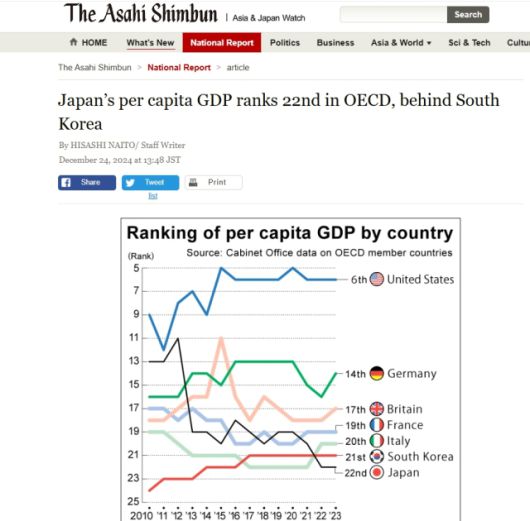 하지만 지금은 다르다. 여전히 일본의 강점이 많지만 그에 비해 한국의 강점도 더 많다. 특히 한국의 1인당 국민소득(GDP)은 지난 2023년 일본의 추월한 후 2024년에도 앞섰고 지난해도 마찬가지일 것으로 추정된다. 조사기관마다 다소 차이는 있지만 IMF 보고서에 따르면 2024년 기준 한국의 1인당 국민 소득은 3만 6238달러, 일본은 3만 2443달러였다.