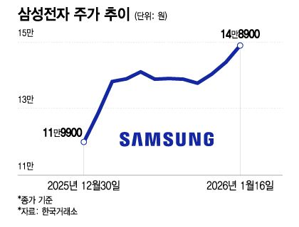 18일 한국거래소(KRX)에 따르면 지난 16일 삼성전자는 전거래일 대비 5000원(3.47%) 오른 14만8900원에 거래를 마쳤다. 장중에는 14만9500원까지 오르며 52주 신고가를 경신했다.