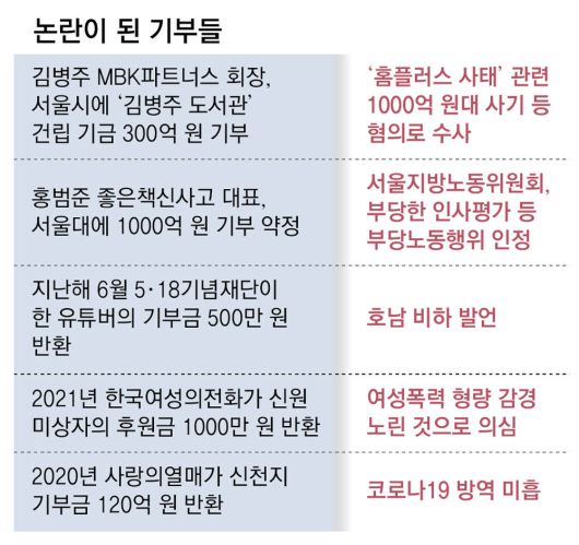 공익 단체가 논란 속 인물, 단체의 기부를 거부하는 사례도 계속되고 있다. 지난해 6월 5·18기념재단은 호남을 비하하는 게시글로 논란을 빚은 한 유튜버의 기부금 500만 원을 거부했다. 2021년 한국여성의전화는 신원 미상자의 후원금 1000만 원을 반환했다. 후원자가 여성 폭력에 대한 처벌 감경을 노렸다는 의혹이 제기됐기 때문이다.