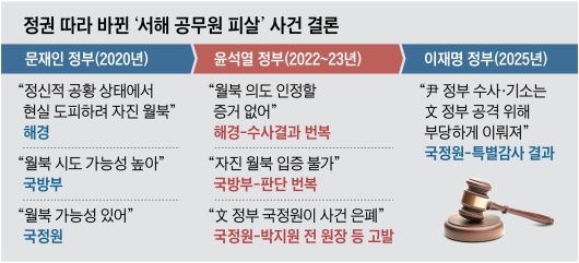 서울중앙지법 형사25부(재판장 지귀연)가 지난달 26일 ‘서해 공무원 피살 은폐’ 혐의를 받는 서훈 전 국가안보실장과 서욱 전 국방장관, 박지원 전 국가정보원장 등 문재인 정부 인사 5명에게 무죄를 선고했다. 18일 본지가 확보한 700쪽 분량의 1심 판결문에는 2020년 9월 해양수산부 공무원이었던 고(故) 이대준씨의 실종부터 북한군에 의한 피격·소각 경위, 정부의 대응 과정이 상세히 담겼다. 판결문에는 사건을 바라보는 국정원의 입장이 정권이 바뀔 때마다 어떻게 달라졌는지도 포함됐다.