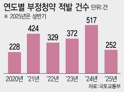 국토교통부는 2020년 부동산 급등기에 부정청약 논란이 거세지자 전국적으로 부정청약을 점검하기 시작했다. 적발건수는 △228건(2020년) △424건(2021년) △329건(2022년) △372건(2023년) △517건(2024년) △252건(2025년 상반기)으로 그 규모가 추세적으로 늘고 있다.