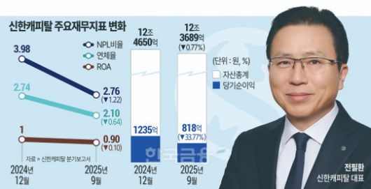 전필환 신한캐피탈 대표 취임 이후 공격적인 부동산 익스포저 정리와 자산 클렌징으로 건전성 지표를 회복한 신한캐피탈이 올해 생산적 금융과 프라이빗 크레딧을 앞세워 본원적 수익력을 되살릴 수 있을지 주목된다. 회사는 올해 포트폴리오 다각화와 AI 기반 업무 효율화 등을 통해 안정적인 성장 체계 확립을 이어갈 계획이다.
