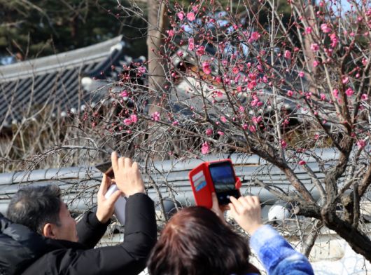 절기상 1년 중 가장 춥다는 대한(大寒)을 이틀 앞둔 18일 강원 강릉시 초당동의 한 공원을 찾은 시민들이 활짝 핀 홍매화를 휴대전화 카메라에 담고 있다.