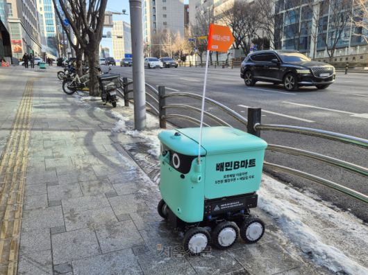 지난 13일 배달의민족 앱으로 B마트 로봇배달 주문을 넣은 지 20분 만에 자동 안내 전화가 왔다. 목적지인 서울 논현동의 한 건물 1층에는 민트색의 배달로봇 ‘딜리’가 건물 앞 이면도로에 있었다. 휴대전화 알림 메시지에서 ‘상품 꺼내기’ 버튼을 누르자 잠금장치가 풀렸다. 빙판길이었지만 딜리가 가져온 상품은 흐트러짐이 없었다.