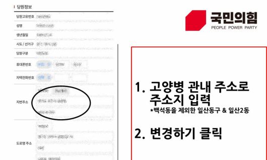 신천지 전 신도인 ㄱ씨는 18일 한겨레에 “2023년 말 신천지 쪽으로부터 신도들을 국민의힘 신규 당원으로 가입시키라는 지시를 받았고, 기존 당원은 (당원 정보 주소를) 경기 고양시로 변경하라는 요구를 받았다”고 밝혔다. ㄱ씨가 2023년 12월30일 교단 쪽으로부터 받은 텔레그램 메시지를 보면, 신천지는 “지역별 목표 수만큼 (국민의힘) 가입 및 주소 변경”을 지시하면서 회원 가입 시 주소를 ‘경기 고양갑 및 고양병 지역’으로 설정하라고 했다.