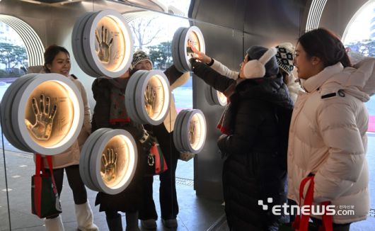 한한령 해제와 방한시장 확대에 대한 기대감이 커지는 가운데 유통가가 외국인 관광객 유치를 위한 새단장에 나섰다. 13일 서울 중구 롯데면세점 스타에비뉴에서 관광객이 K팝 스타들과 손을 맞춰볼 수 있는 '스타 하이파이브'를 체험하고 있다. 김민수기자 mskim@etnews.com |