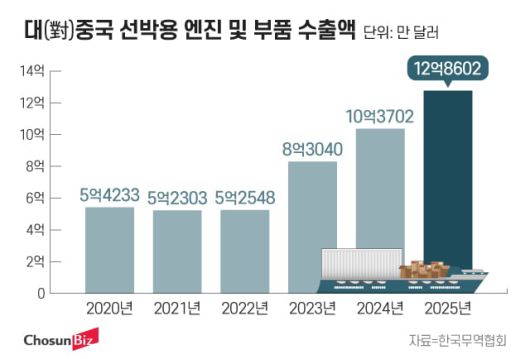 이는 2023년 및 2022년과 비교하면 각각 54.8%, 144.7% 급증한 수치다. 글로벌 선박 수주량의 63%를 차지하며 압도적 1위를 기록하고 있는 중국 조선업이 한국산 엔진 주문량을 계속 늘리고 있는 것이다.