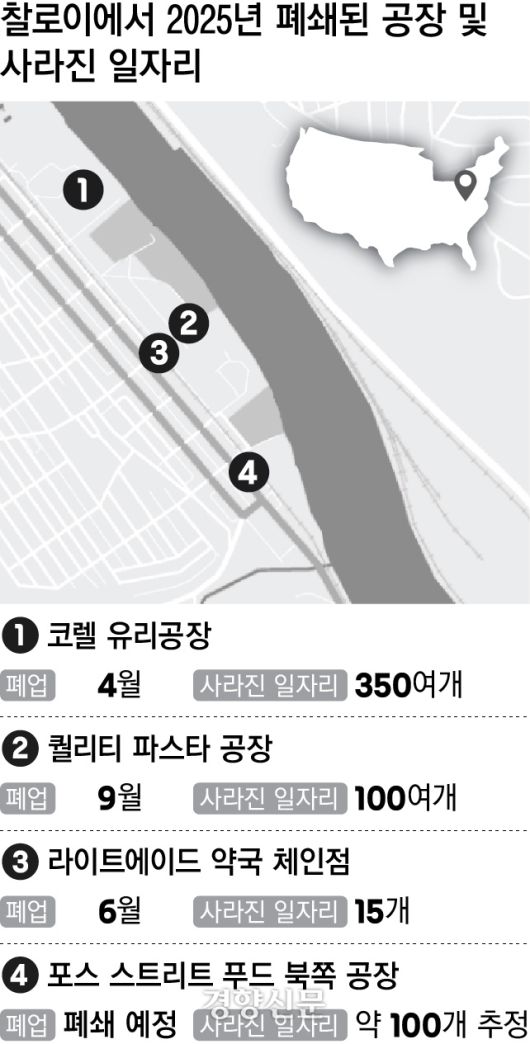 지난 한 해 동안 찰로이에서 문 닫은 공장은 이곳만이 아니다. 유리 공장으로부터 불과 몇 블록 떨어진 곳에 있는 ‘퀄리티 파스타’ 공장도 지난해 9월 폐업했다. 그곳에서 일하던 100여명이 일시에 해고됐다. 퀄리티 파스타 공장 길 건너편에 있는 대형 약국 체인점 ‘라이트 에이드’ 매장은 본사가 파산하면서 지난해 6월 문을 닫았다. 15명 가량의 직원들은 일자리를 잃었고, 찰로이 주민들은 이 지역 유일의 조제 약국이 사라진 후 큰 불편을 겪고 있다. 퀄리티 파스타 공장과 라이트 에이드 매장 둘 다 아직도 새 인수자를 찾지 못해 공실로 방치돼 있다.