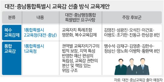 7월 통합특별시 출범이 거의 확실시되는 광주·전남의 경우 이번 지방선거에서 초대 통합특별시장과 통합교육감을 1명씩 선출하는 것에 합의했다. 그러나 대전·충남의 경우 행정통합을 주도했던 국민의힘이 마련한 특별법안을 뒤로하고 더불어민주당이 이달 안에 새로 특별법안을 제정하겠다고 나서면서 지역 교육계의 혼란과 우려는 커지고 있다.