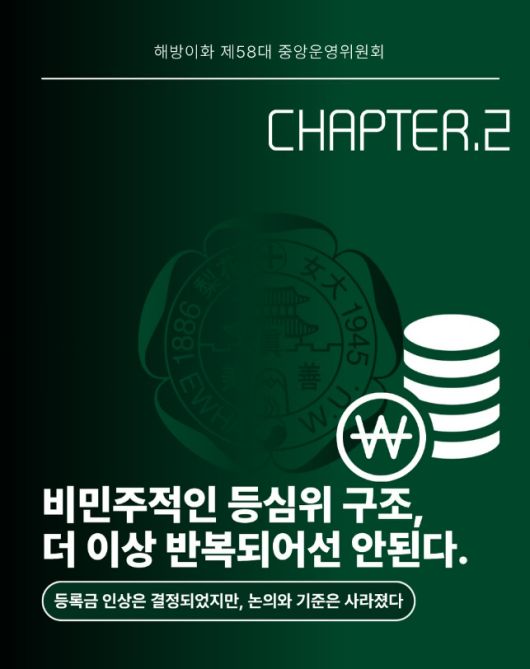 이화여대 등심위는 학생위원 6명과 학교위원 6명, 학교가 선임한 외부전문가 1명으로 이뤄진다. 학생위원 전원이 반대해도 학교가 요구하는 안이 통과될 수 있는 구조다. 실제로 지난해 이화여대와 고려대 등에선 외부전문가가 학교의 손을 들면서 인상 결정이 일방적으로 이뤄졌다는 지적이 나왔다.