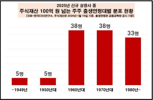 기업분석 전문기관 한국CXO연구소는 19일 ‘2025년 신규 상장사 대상 주식평가액 100억원 이상 주주 현황 조사’ 결과를 발표했다. 조사 대상은 지난해 한국거래소에 신규 상장한 121개 상장사의 개인 주주로, 주식평가액은 올해 1월 16일 종가 기준으로 산출됐다.