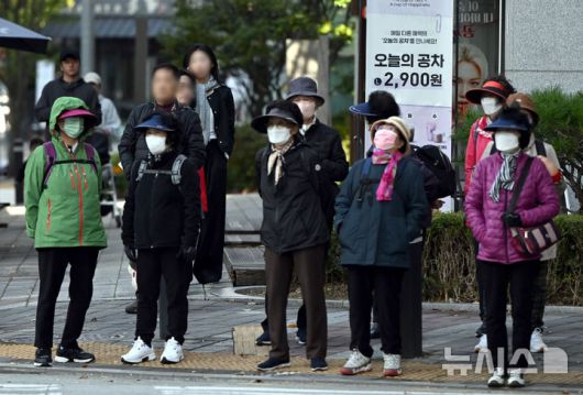 [광주=뉴시스] 이현행 기자 = 27일 오전 광주 서구 치평동 한 거리에서 시민들이 추위에 맞서 꽁꽁 싸맨 채 횡단보도를 기다리고 있다. 이날 광주 일최저기온은 광주 무등산이 2.8도를 기록했다. 2025.10.27. lhh@newsis.com |