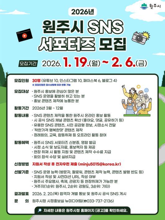 [스포츠서울ㅣ원주=김기원기자]원주시는 참신한 아이디어와 열정을 가진 ‘2026년 원주시 SNS 서포터즈’를 다음 달 6일까지 모집한다.
