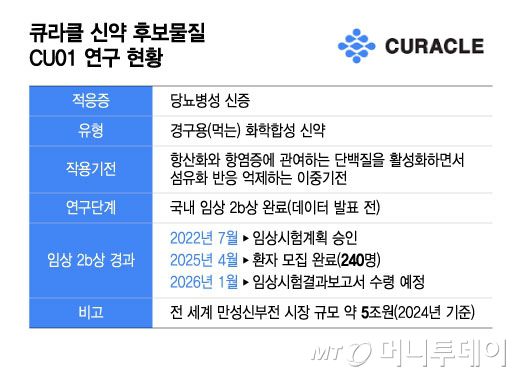큐라클이 당뇨병성 신증 치료제 'CU01'의 임상 2b상을 완료했다. CU01 임상 2b상은 큐라클의 혁신신약 연구 역량을 입증할 기회다. 특히 CU01 임상 2b상에 성공하면 큐라클이 보유한 여러 신약 파이프라인의 임상 연구와 상업화 행보에 탄력이 붙을 수 있다. 큐라클은 올해 글로벌 기술이전 성과를 확보하는 데 집중하겠단 목표다.