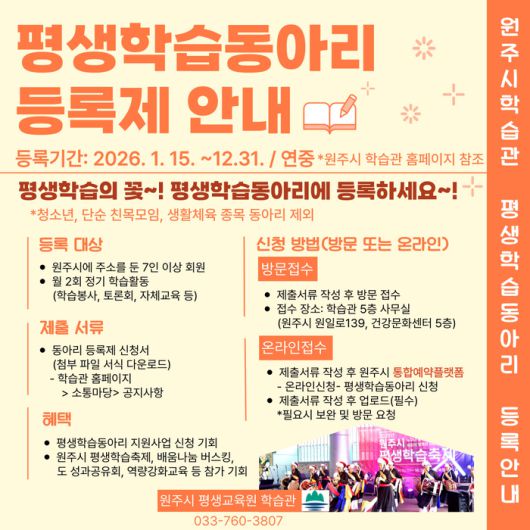 [스포츠서울ㅣ원주=김기원기자]원주시 평생교육원 학습관은 관내에서 활동하고 있는 잠재적 평생학습동아리를 발굴하기 위해 ‘평생학습동아리 등록제’를 운영하고 있다.
