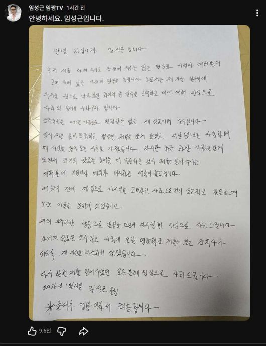 임 씨는 유튜브 채널에 자필 사과문을 올려 "음주 운전은 어떤 이유로도 변명할 수 없는 내 잘못이며 실수"라며 "더 늦기 전에 고백하고 사과드리는 것이 도리라고 판단했다"고 밝혔습니다.
