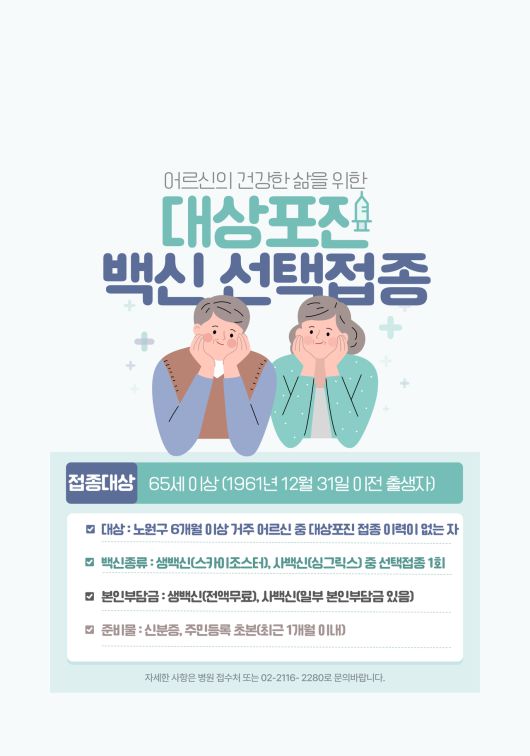 한편, 2026년 대상포진 무료 예방접종 지원 대상은 노원구에 6개월 이상 거주 중인 65세 이상 어르신(1961년 12월 31일 이전 출생자) 가운데 대상포진 예방접종 이력이 없는 경우다. 과거 대상포진을 앓았더라도 완치 후 6~12개월이 경과했다면 접종이 가능하다.