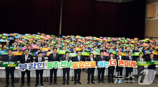 16일 오후 광주 서구 김대중컴벤션센터에서 강기정 광주시장과 국회의원, 공공기관장 등이 함께하는 '광주전남 행정통합 추진 시도민협의회' 발대식이 진행되고 있다. 2026.1.16/뉴스1 ⓒ News1 박지현 기자 |