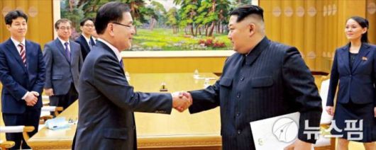 [서울=뉴스핌] 이영종 통일전문기자 = 남북 정상회담 개최를 위한 대북 특사로 2018년 3월 5일 평양을 방문한 정의용 당시 청와대 국가안보실장이 김정은 북한 국무위원장에게 문재인 당시 대통령의 친서를 전달하고 있다. 왼쪽부터 윤건영 청와대 국정상황실장, 서훈 국가정보원장, 천해성 통일부 차관, 정의용 특사, 김정은, 김여정 노동당 제1부부장(당시 직책). [사진=청와대 제공] 2026.01.19 yjlee@newspim.com |