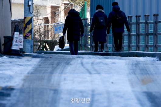 서울 성북구 성북동 골목길이 밤사이 내린 눈·비로 얼어 있다. 문재원 기자 |