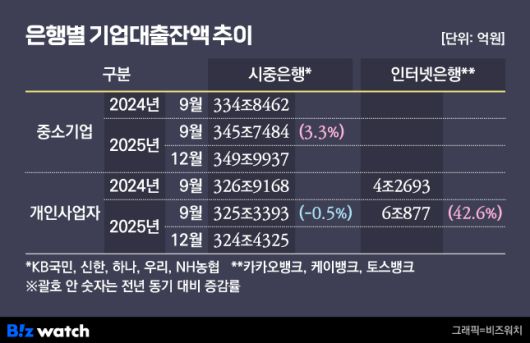 개인사업자 대출은 인터넷뱅크에서 급성장 중이다. 2024년 9월말 4조2693억원이었던 인터넷뱅크 3사(카카오·케이·토스)의 개인사업자 대출 잔액은 1년 만인 지난해 9월말 6조877억원으로 42.6%(1조8184억원) 증가했다. 이 기간 시중은행 개인사업자 대출 잔액이 줄어든 만큼 인터넷뱅크는 늘어났다. 아직 집계 전이나 지난해 12월말까지도 잔액이 불어났을 것으로 추정되고 있다.