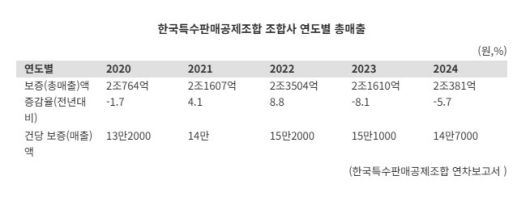 18일 한국특수판매공제조합 연차보고서에 따르면 지난 2024년 기준 특판조합 공제보증 총액은 2조381억원으로 전년 대비 5.7% 감소했다. 공제보증 총액은 조합 회원사들의 총매출액이다. 특판조합 회원사 총매출액은 2년 연속 감소세다. 지난 2022년 2조3504억원으로 정점을 찍은 후 2023년 2조1610억원, 2024년(2조381억원)으로 줄었다. 지난해도 이런 추세가 이어진 것으로 알려졌다.