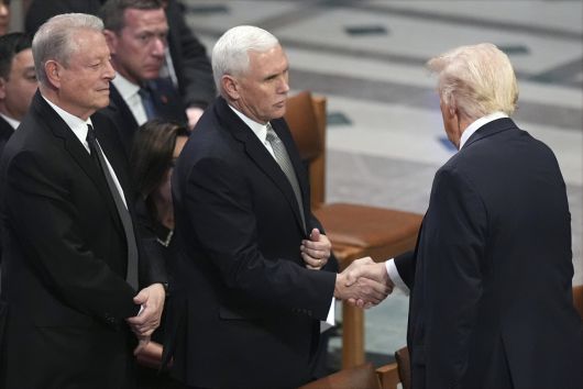 도널드 트럼프 미국 대통령(우측)과 악수하는 마이크 펜스 전 부통령(중앙).[연합] |
