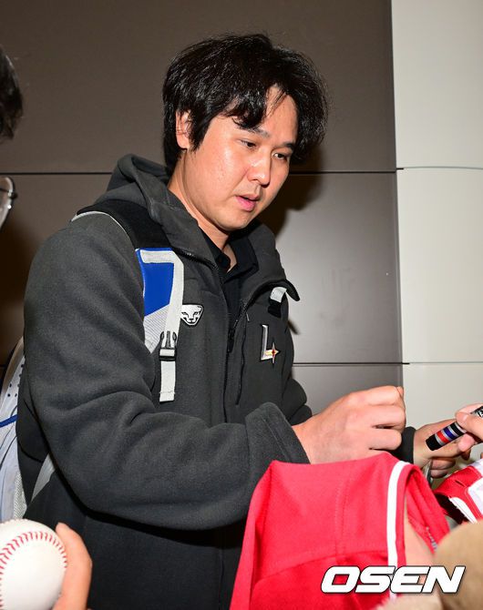[OSEN=인천공항, 최규한 기자] 프로야구 SSG 랜더스 스프링캠프 선발대가 19일 오전 인천공항을 통해 미국 플로리다로 출국했다. SSG는 2026 시즌을 준비하기 위해 미국 플로리다주 베로비치에서 1차 스프링캠프를 펼친다. SSG 최정이 출국을 앞두고 팬들에게 사인을 전하고 있다. 2026.01.19 / dreamer@osen.co.kr
