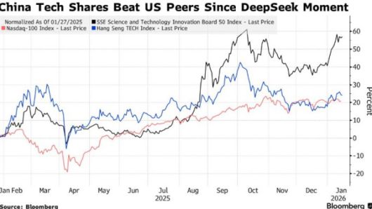 자국 기술에 대한 열광은 지난 4월 이후 중국 주식 강세장의 가장 큰 단일 동력이었으며, 이는 세계 2위 경제 대국이 주택 침체와 빈약한 소비에 빠져 있는 상황에서도 이어졌다. 이러한 모멘텀은 앞으로 몇 달 동안 딥시크가 새로운 AI 모델을 출시하고 중국이 기술 자립을 우선시하는 5개년 경제 청사진을 공개하면서 추가 지원을 받을 수 있다.