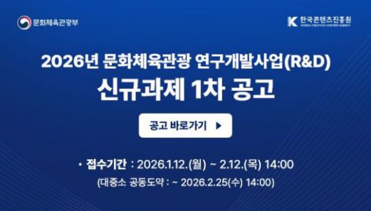 문화체육관광부와 한국콘텐츠진흥원은 19일 이 같은 내용의 '2026년 문화체육관광 연구개발 사업' 계획을 밝혔다. 전년보다 454억원 늘어난 규모로, 인공지능(AI)과 콘텐츠의 융합을 통해 국가 전략 산업으로서 경쟁력을 확보한다는 방침이다.