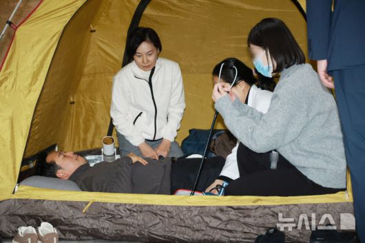 [서울=뉴시스] 고승민 기자 = 나흘째 단식투쟁 중인 장동혁 국민의힘 대표가 18일 서울 여의도 국회 로텐더홀에서 의료진에게 진찰을 받고 있다. 2026.01.18. kkssmm99@newsis.com |