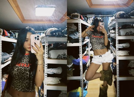 공개된 사진 속 허니제이는 레오파드 패턴의 크롭 톱에 짧은 러플 스커트를 매치, 90~2000년대 감성이 묻어나는 복고 패션을 완성했다. 특히 허리 라인이 드러나는 스타일로 탄탄한 복근과 늘씬한 보디라인이 도드라져 눈길을 끌었다.