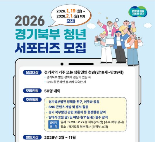 선발된 서포터즈는 2~10월 경기 북부 발전 관련 홍보 콘텐츠를 제작한다. 토론회·포럼 등 정책 논의에도 참여할 수 있다. 활동 실적에 따라 활동비가 지급되며, 우수 활동자에게는 도지사 상장이 수여된다.